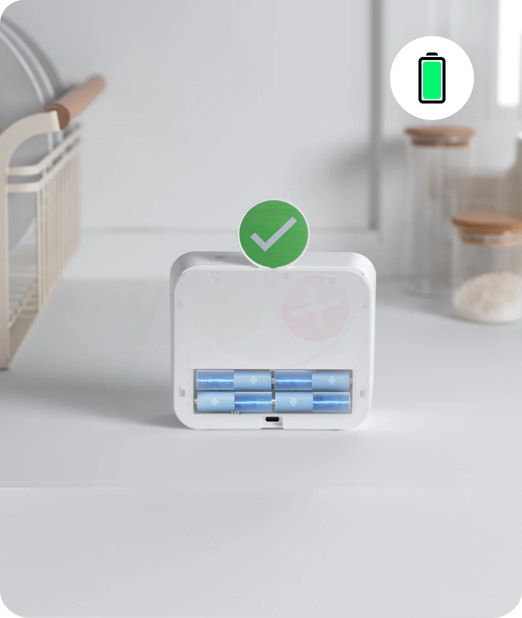 You can power the device using 4 AA batteries or by connecting it via a USB-C cable to a power source.